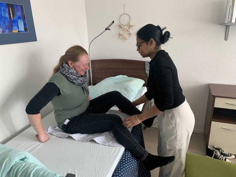 Die Mitarbeiterin Cynthia hebt Tamara ins Bett.