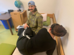 Tamara kann mithelfen, indem sie sich am Hals (Zwischenraum) der Mitarbeiterin festhält/festklammert. Die Zwischenräume bei beiden sind blockiert, weil sich Gewicht halten müssen. Für Cynthia eine Mehrbelastung - für Tamara wenig Selbstwirksamkeit.